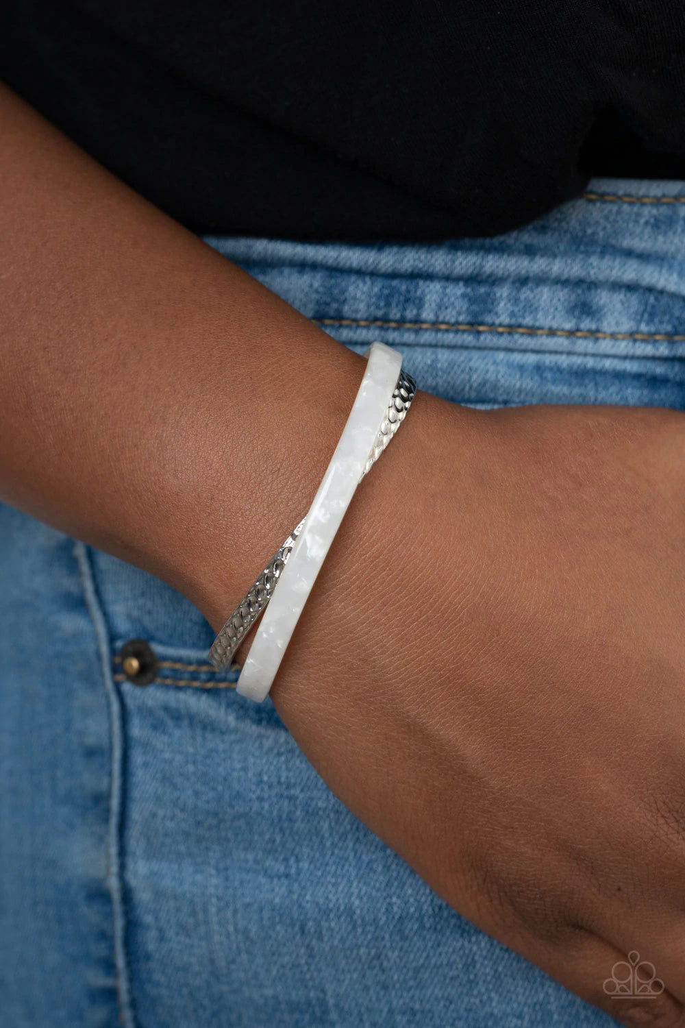 Featuring a marble-like finish, a white acrylic frame curls around a dainty silver cuff, creating a colorfully stacked look across the wrist.