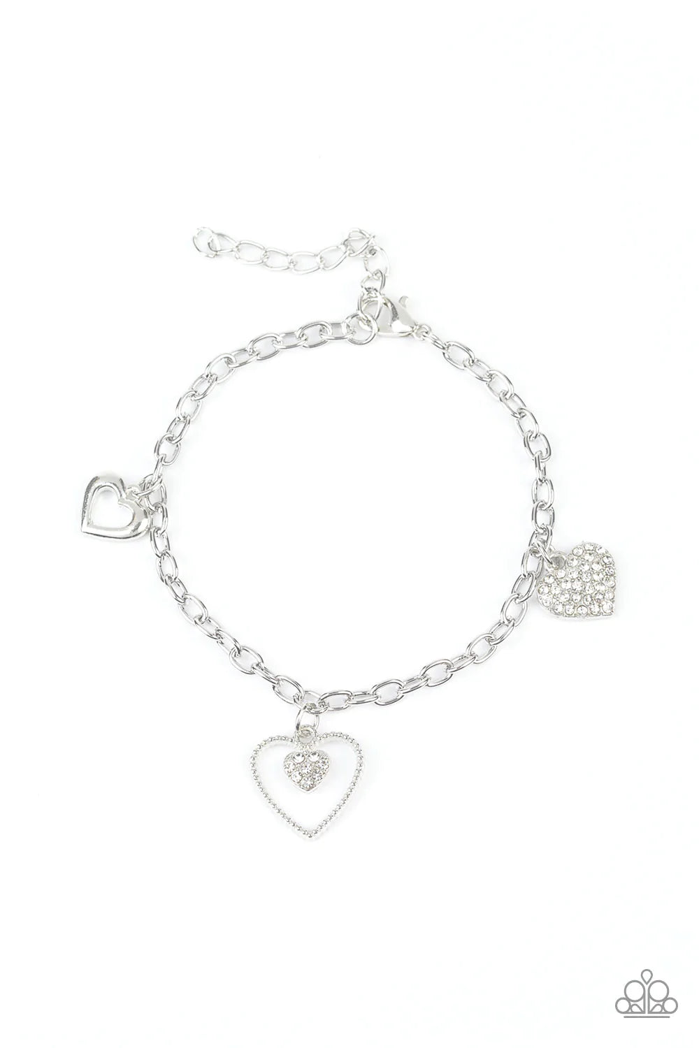 A charming collection of silver hearts and white rhinestone encrusted heart frames dangle from a glistening silver chain, creating a flirtatious fringe around the wrist. Features an adjustable clasp closure.