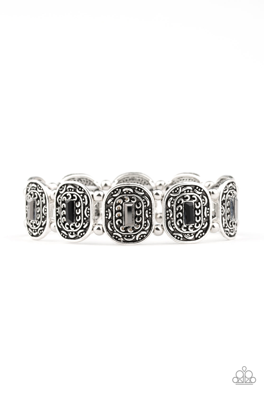 Featuring smoky emerald-cut rhinestone centers, ornate silver frames are threaded along stretchy bands around the wrist for a refined fashion.