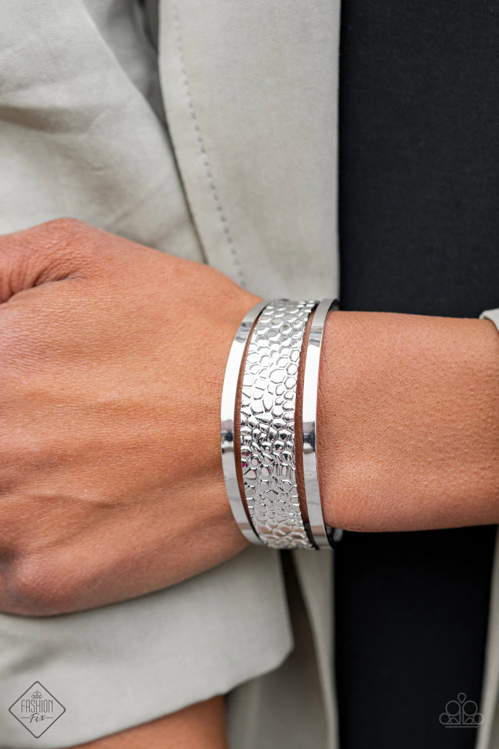 A silver cuff embossed in metallic crocodile-like print is flanked by two sleek silver bars, creating an airy silver cuff for a wildly stacked look.