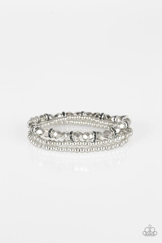 Infused with hematite rhinestone encrusted rings, mismatched dainty silver and faceted silver beads are threaded along stretchy bands for a refined look. Sold as one set of three bracelets.