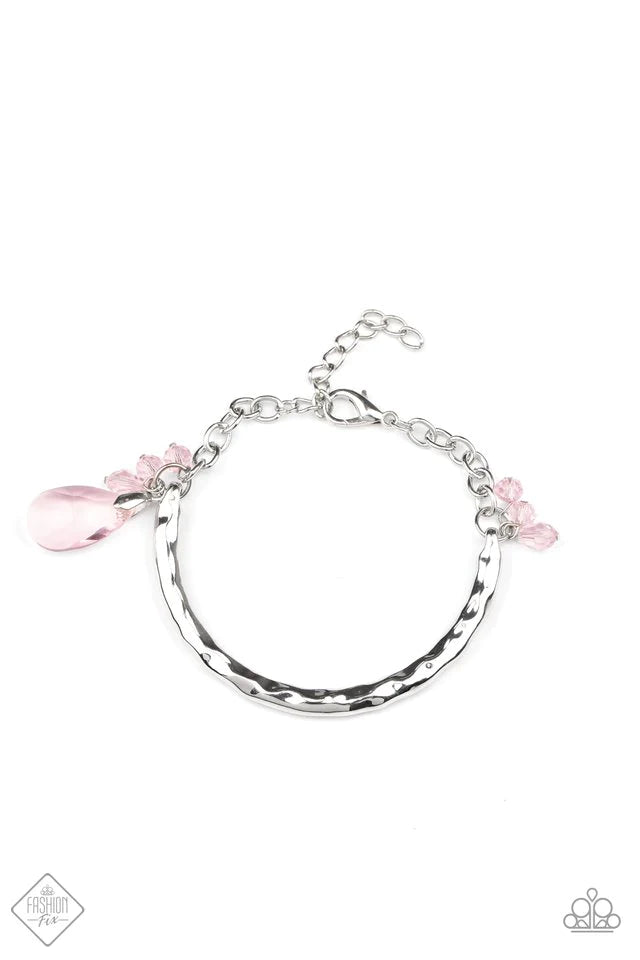 A hammered silver bar delicately attaches to a strand of shimmery silver chain adorned in clusters of pink crystal-like beads. A glowing pink teardrop crystal swings from the display for a dramatically effortless finish. Features an adjustable clasp closure. Sold as one individual bracelet.