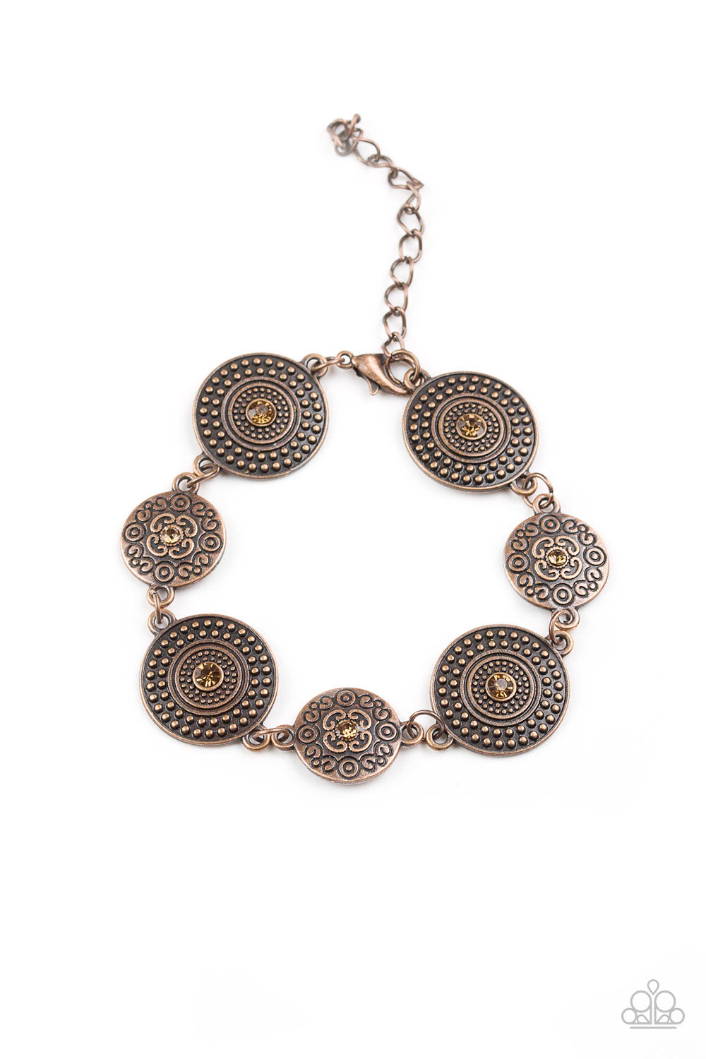 Dotted in dainty topaz rhinestones, filigree stamped frames link around the wrist in a whimsical fashion. Features an adjustable clasp closure. Sold as one individual bracelet.