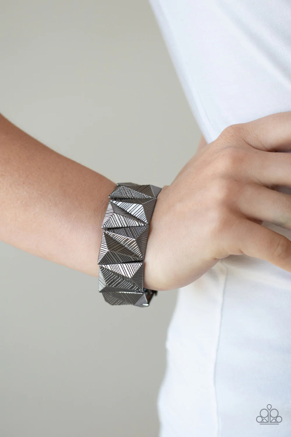 Etched in linear textures, triangular gunmetal frames are threaded along stretchy bands around the wrist for an edgy look.