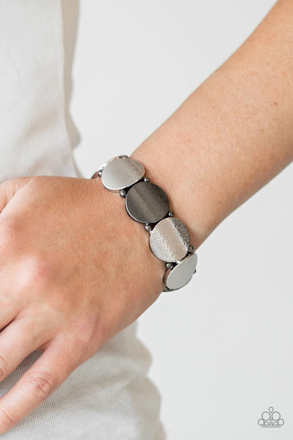 Infused with pairs of dainty gunmetal beads, delicately hammered gunmetal and silver discs slide along a stretchy band around the wrist for a hint of industrial flavor.