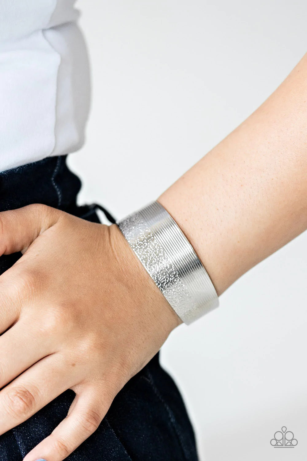 One half of a thick silver cuff is engraved in stacked linear lines while the other half is hammered in a row of tactile textures, creating a collision of texture around the wrist.