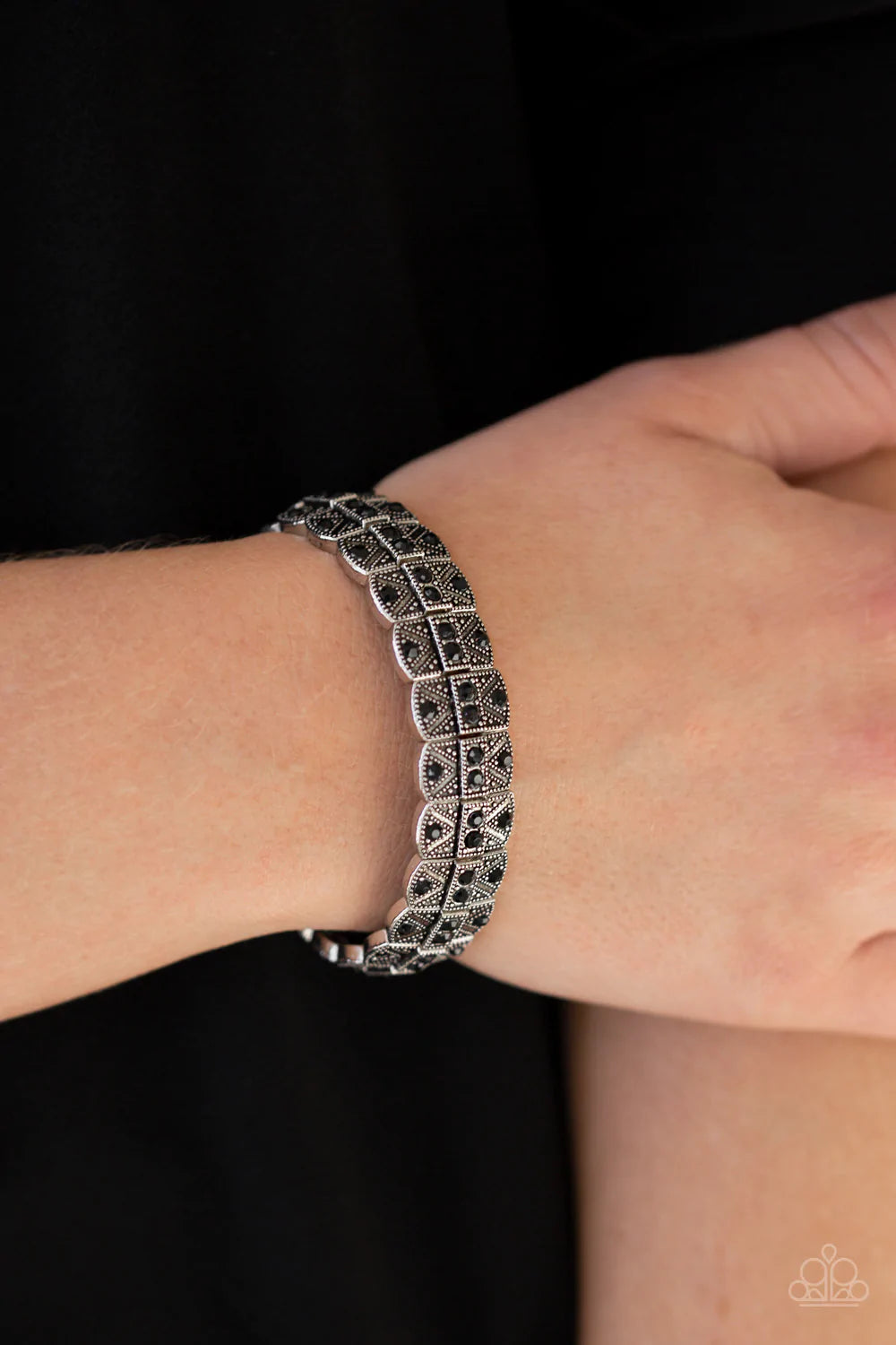 Encrusted in glittery black rhinestones, ornately studded silver frames are threaded along stretchy bands for an edgy-glamorous look.