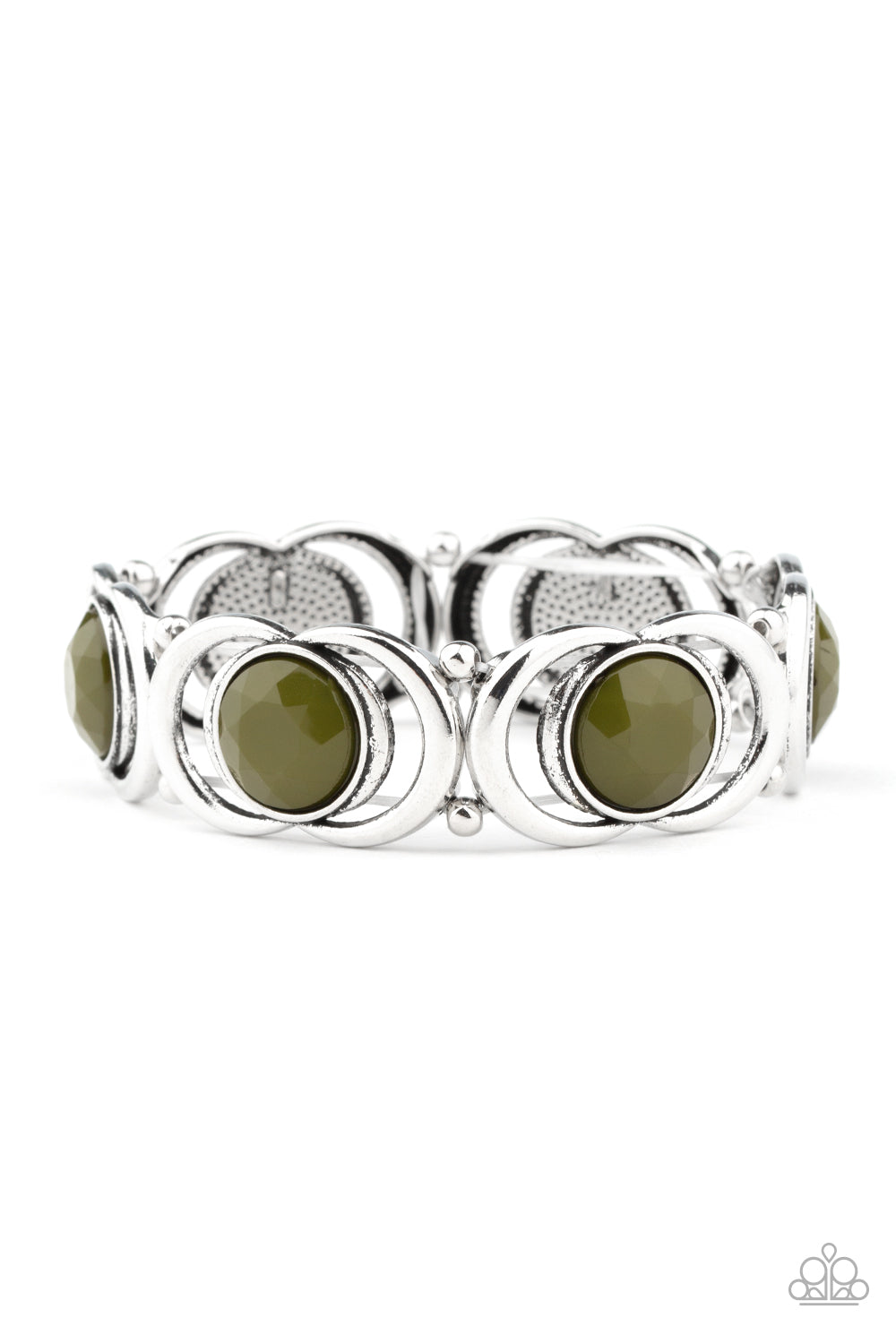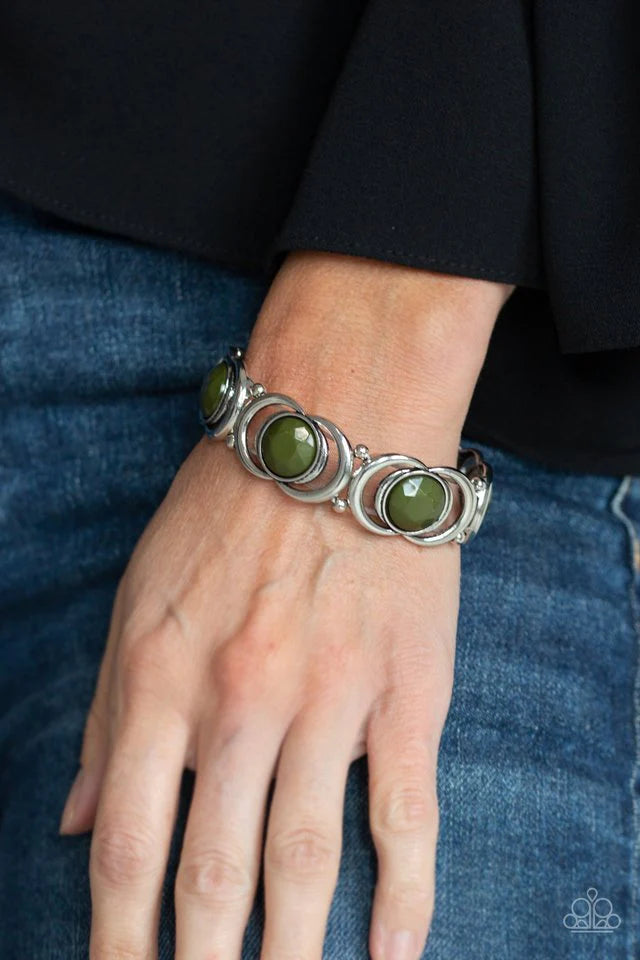 Faceted green beads are pressed into the center of interconnecting silver circles. Infused with dainty silver beads, the colorful frames are threaded along stretchy bands around the wrist for a whimsical look. Sold as one individual bracelet.