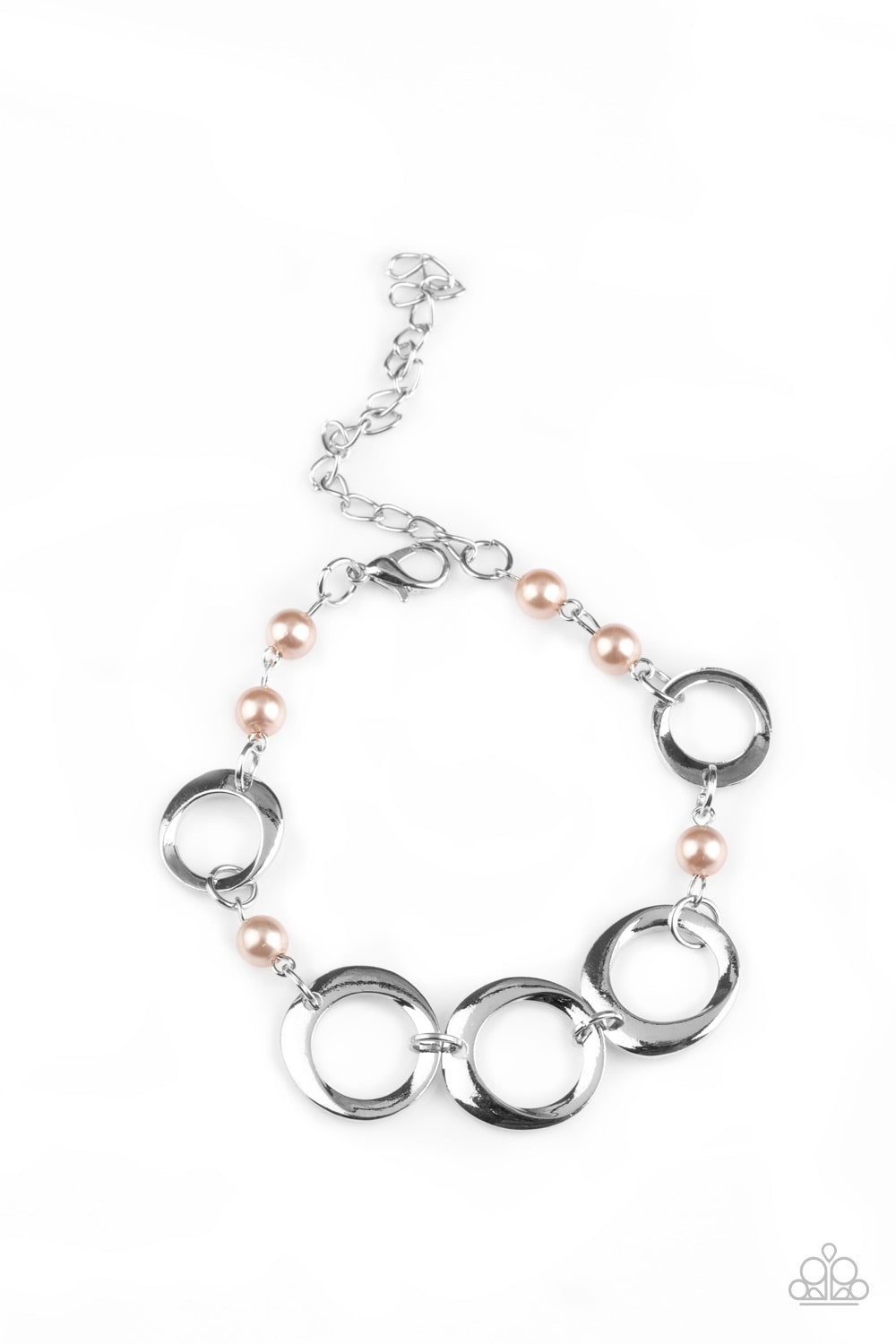 Asymmetrical silver hoops connect with pearly brown beads across the wrist for a refined look. Features an adjustable clasp closure. Sold as one individual bracelet.