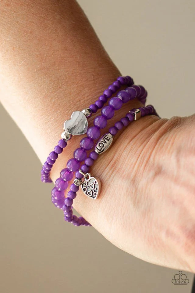 An array of glassy and polished purple beads are threaded along stretchy bands. Infused with silver accents, a collection of silver heart charms and a bead spelling out the word, "love", adorn the beaded strands for a romantic finish. Sold as one set of three bracelets.
