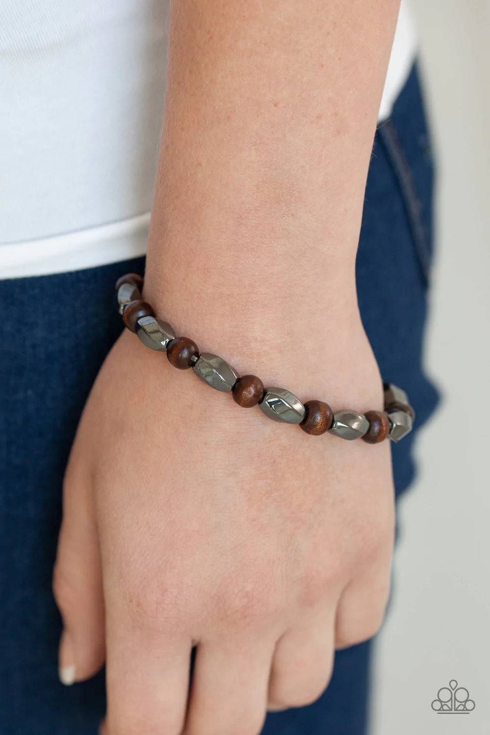 An earthy collection of faceted gunmetal beads and smooth wooden beads are threaded along a stretchy band around the wrist for a bold seasonal look.