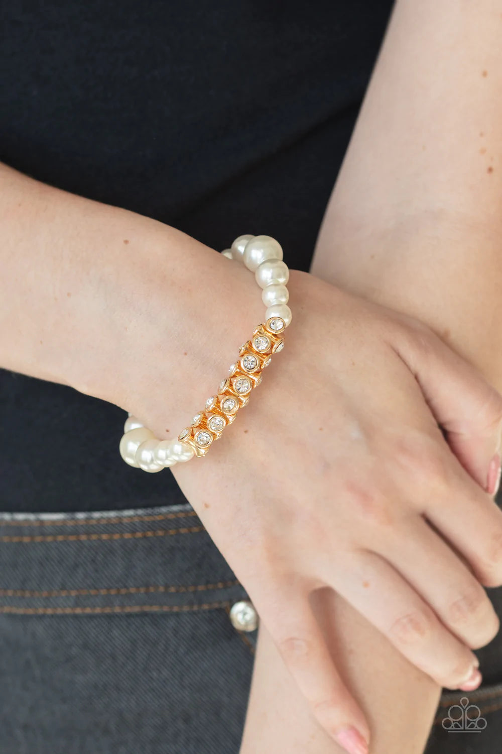 A collection of white pearls and white rhinestone dotted gold frames are threaded along stretchy bands around the wrist, creating a sparkling centerpiece.