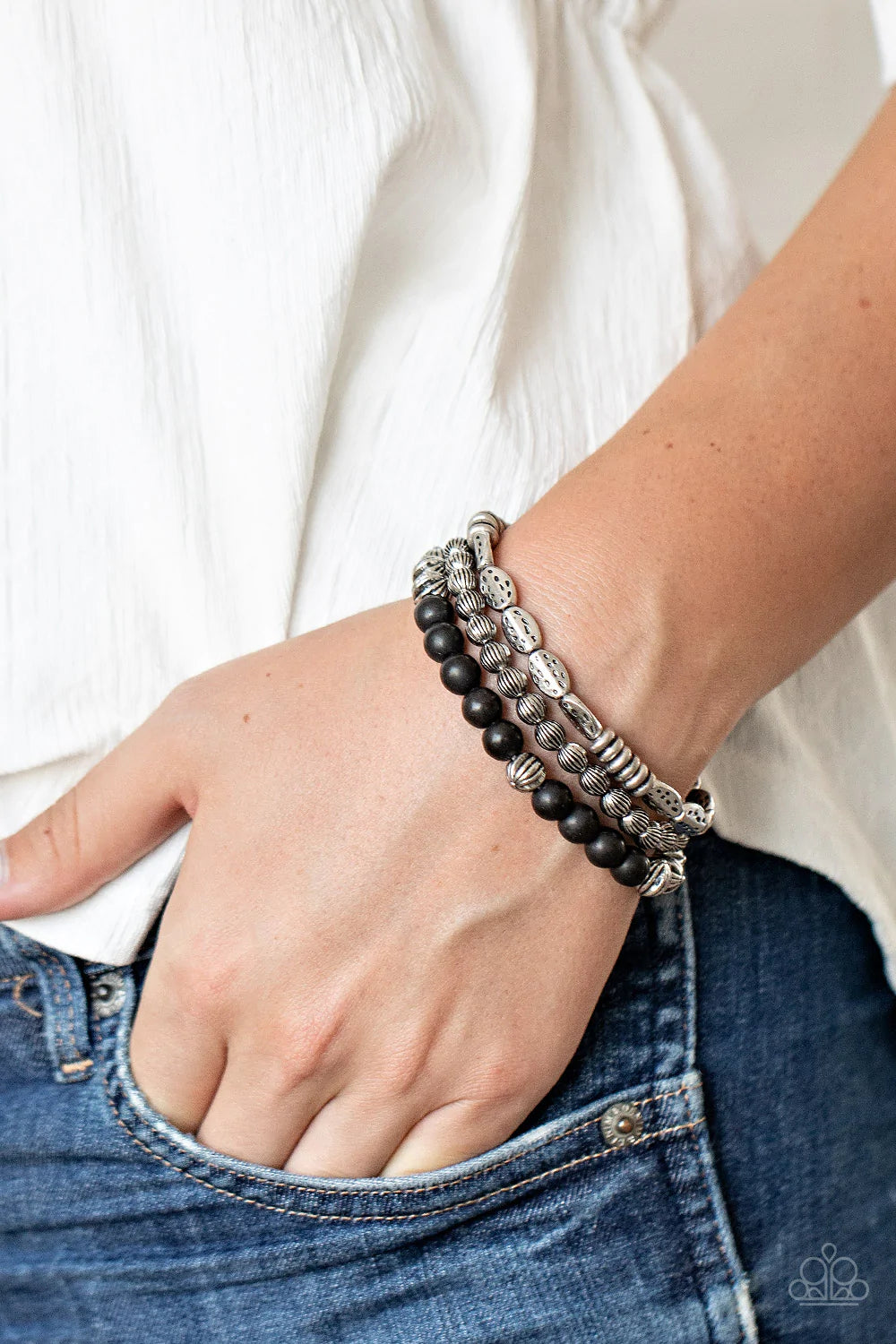 An earthy collision of black stones, ornate silver beads and hammered silver accents are threaded along stretchy bands around the wrist, creating colorful layers.