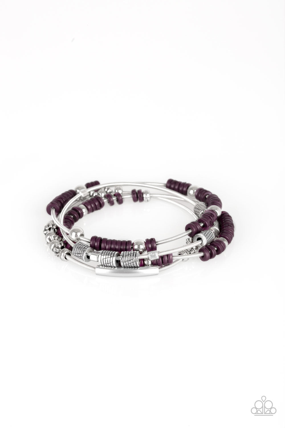 Mismatched silver accents and disc shaped Magenta Purple beading slides along stretchy spring-like wires for a spunky tribal look.