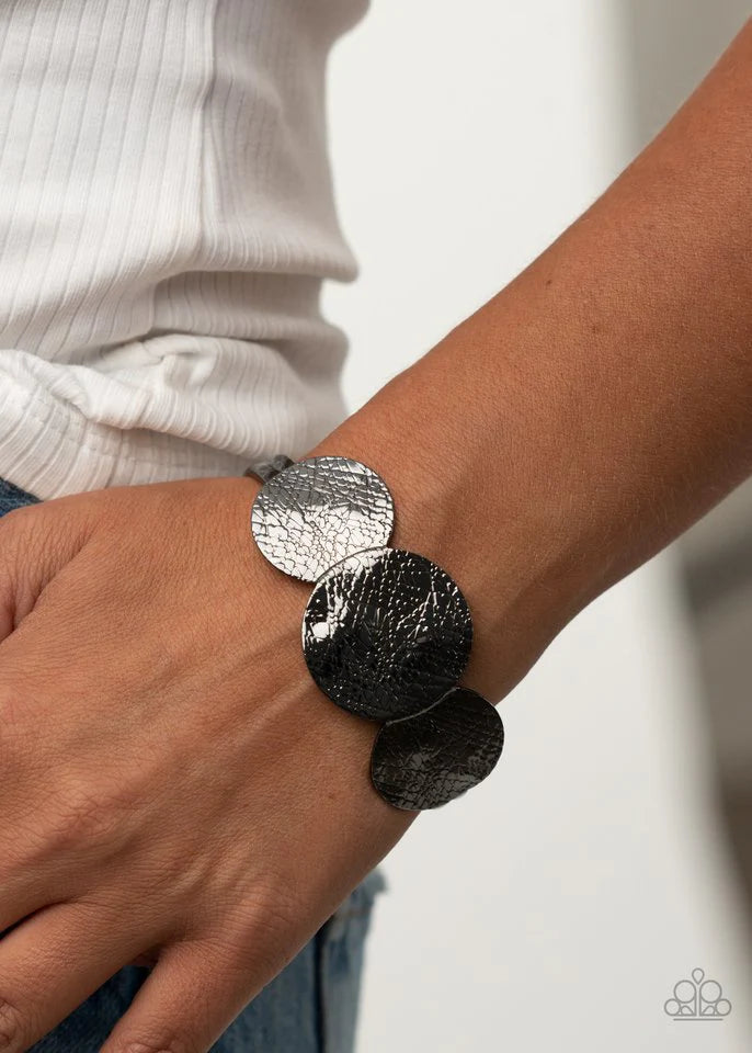 Three gunmetal discs etched in flawless texture and delicately hammered in ripples sit atop an open gunmetal cuff, creating a bold accent piece. Sold as one individual bracelet.