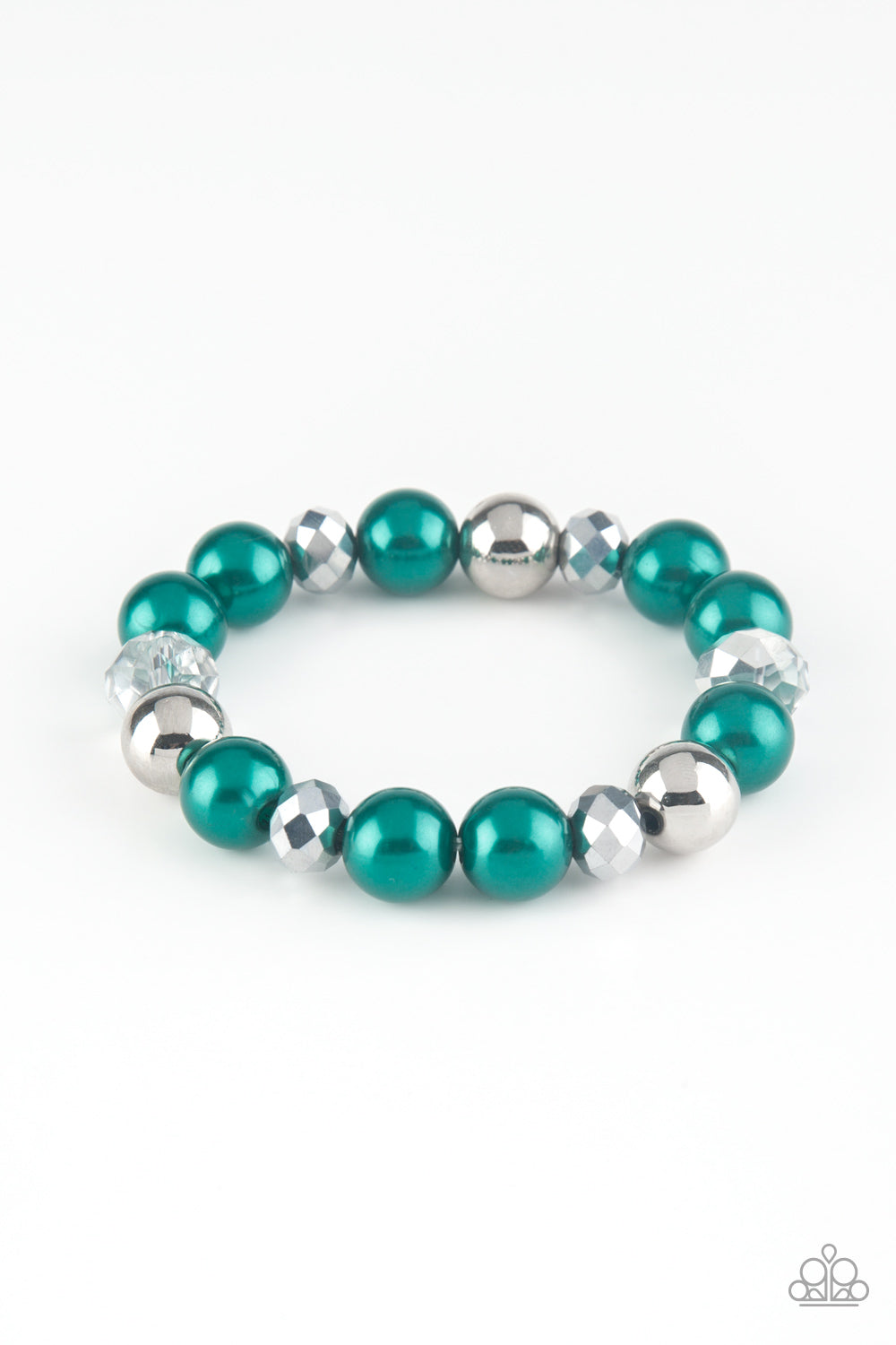 A collection of pearly green, classic silver, and crystal-like hematite beads are threaded along a stretchy band, creating a refined look around the wrist. Sold as one individual bracelet.